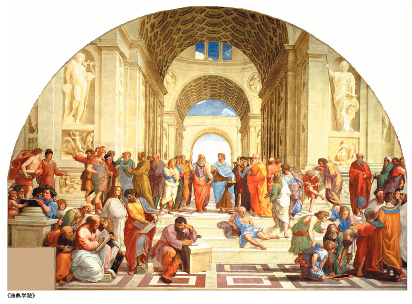 這幅高2.8米,長6.2米的壁畫作品中,安排了50多個人物形象。拉斐爾將不同時期、不同領域的學者并置在古希臘建筑的背景下,構建了一個兼容并包、開放活躍的學術場景。這種歷史大哲的并置,向我們呈現(xiàn)了文藝復興的精神指向。