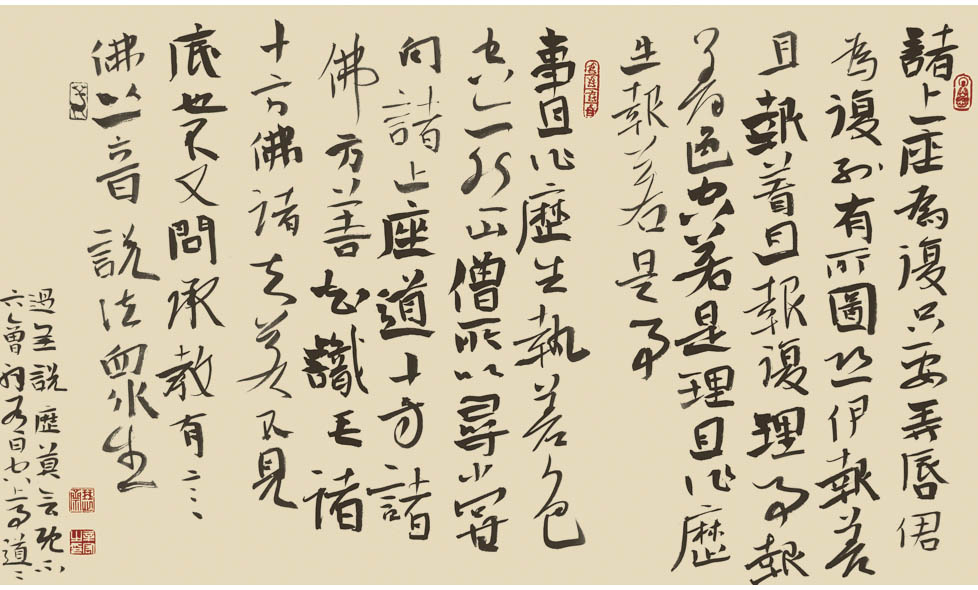 筆尖著紙時筆毫有彈性的觸感,被包圍在筆管周圍的手指敏銳地感受到,這樣的感覺通過手腕到肘,由肘再到臂膀,然后連到你心里,你感受到過嗎?感受過筆尖在紙上畫過時就和劃在你心里一樣嗎?如果其中有一個關(guān)節(jié)被你忽略或者受到阻礙,那么你的感覺就會停止。這樣的感覺出現(xiàn)的機(jī)會不是很多,這樣的感覺出現(xiàn)的時候多了,你會突飛猛進(jìn),出現(xiàn)的時候少了,只能做些基礎(chǔ)的工作,和夢一樣,是不可控制的。有時候突然來了,不可阻擋,有時候一年做不上一個夢。